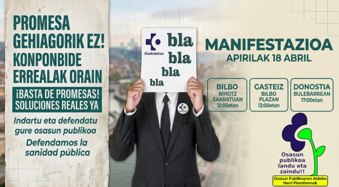 El sindicato secunda las movilizaciones del 18 de abril en Bilbao, Donostia y Gasteiz a favor del sistema sanitario público