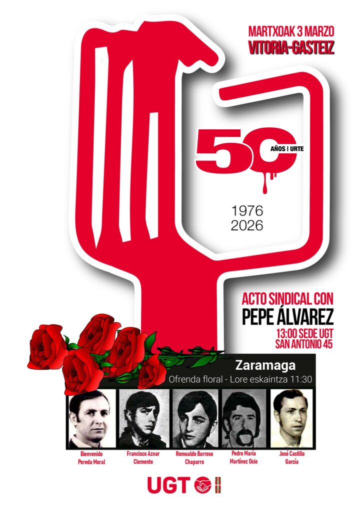 Martxoaren 3an 50 urte beteko dira Gasteizen poliziak 5 langile hil zituela, Trantsizioko gobernuak errepresioz isilarazi nahi izan zuelako hirian antolatutako greba . Aurten, ohiko lore-eskaintza egingo dugu Zaramagako monolitoan, CCOOrekin batera. Pepe Alvarez UGTko idazkari nagusiak parte hartuko du . Goizeko 11:20etan bertaratzeko eskatzen dizuegu, sarraskiaren biktimak gogoratu eta langile borrokaren memoria aldarrikatzeko. 13:00etan, ekitaldi sindikala egingo dugu UGTren egoitzan (San Antonio 45), Pepe Alvarezekin.