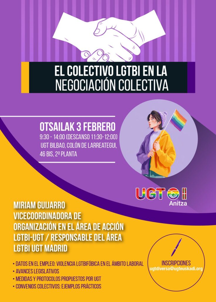 La Unión General de Trabajadoras y Trabajadores de Euskadi, a través de su área LGTBI, UGT Anitza, celebrará el próximo 3 de febrero una jornada de titulada «El Colectivo LGTBI en la Negociación Colectiva». El evento tendrá lugar en la sede del sindicato en Bilbao (Colón de Larreategui, 46 bis, 2ª planta).