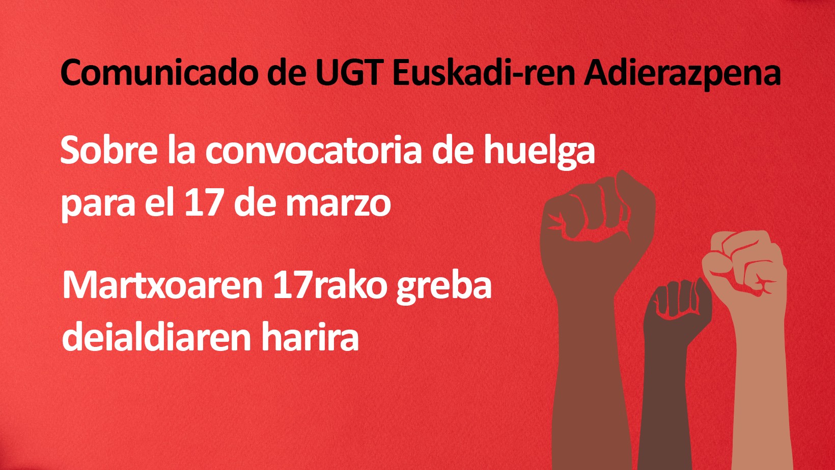 Para UGT Euskadi, la huelga general es una medida de presión excepcional para movilizar con rotundidad a la totalidad de las trabajadoras y los trabajadores, en pro de unos intereses colectivos comunes de gran calado, o contra medidas lesivas que afectan al conjunto de la sociedad.