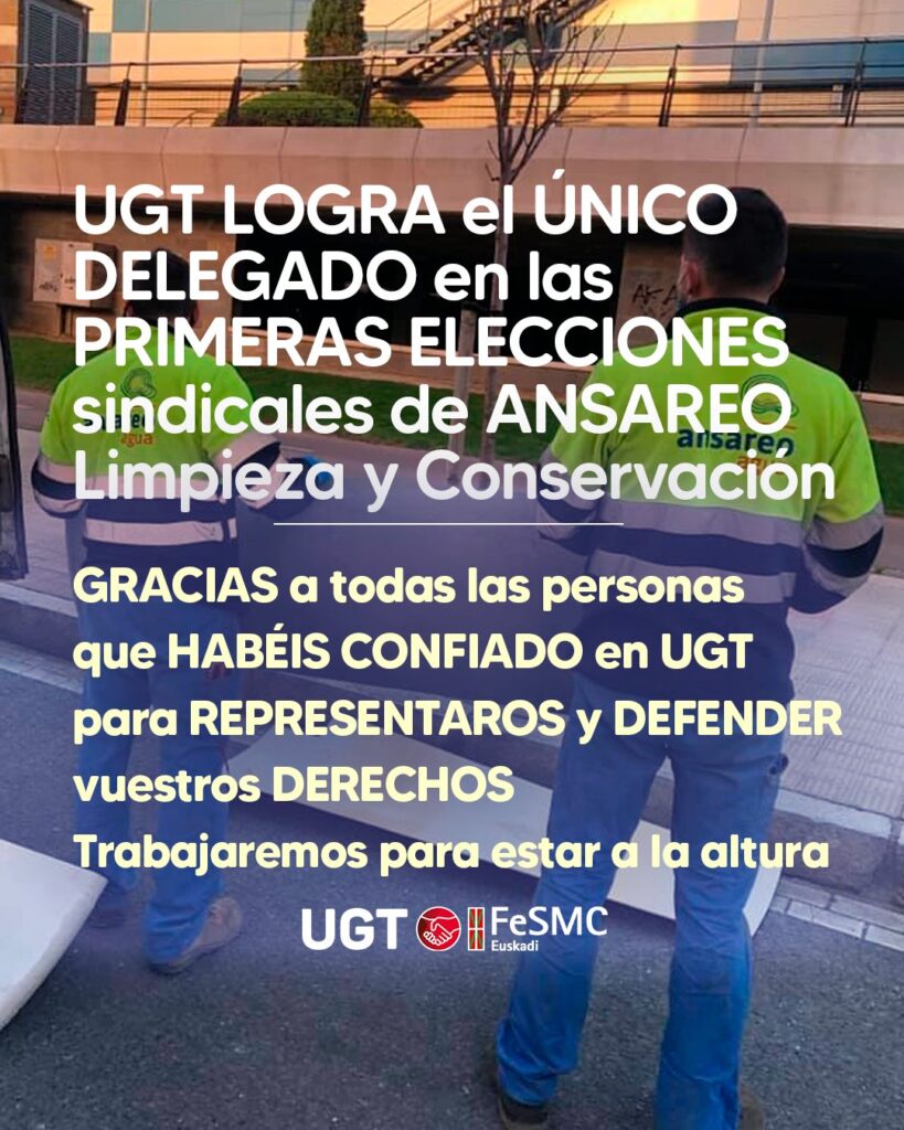 Asimismo, la FeSMC de UGT Euskadi ha informado que ha logrado el único delegado en juego en las elecciones sindicales celebradas por primera vez la pasada semana en Ansareo Limpieza y Conservación. En ambos casos, desde la federación han querido agradecer al conjunto de personas que trabajan en este sector el haber depositado su confianza en UGT, asegurando que trabajarán sin descanso para estar a la altura del apoyo recibido.