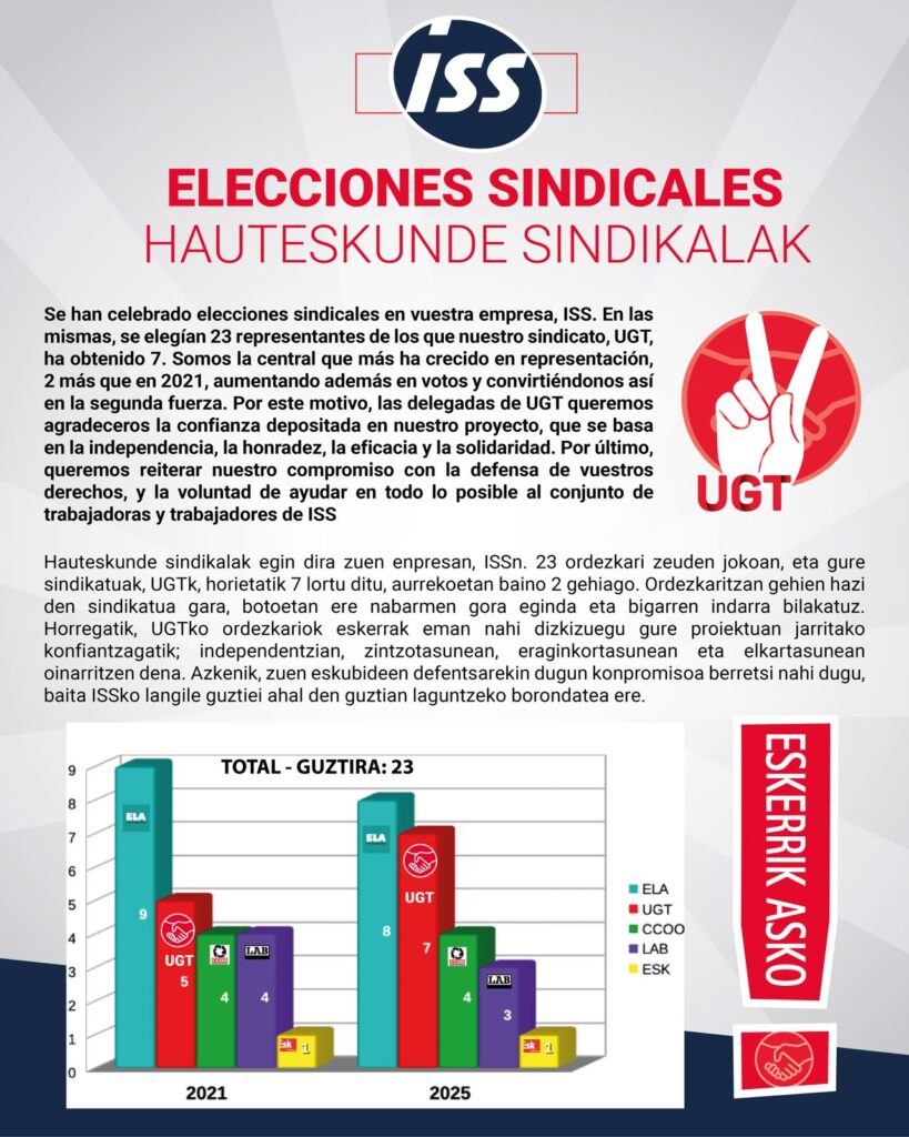 La Federación de Servicios, Movilidad y Consumo de UGT Euskadi ha celebrado los buenos resultados obtenidos en las elecciones sindicales de ISS Facility Services en Bizkaia, la mayor empresa del sector en el territorio, con más de 1200 personas trabajadoras. Las votaciones se celebraron los días 16 y 17 de octubre, tras impugnarse el proceso en abril. UGT ha sido la central que más ha crecido, obteniendo 7 de los 23 representantes del Comité de empresa, 2 más que en los comicios de 2021, y con casi 60 votos más que entonces. Así, se mantiene como la segunda fuerza, tras ELA, recortando distancia con la misma, que baja de 9 a 8 delegados. Completan el Comité CCOO (4), LAB (3) y ESK (1).